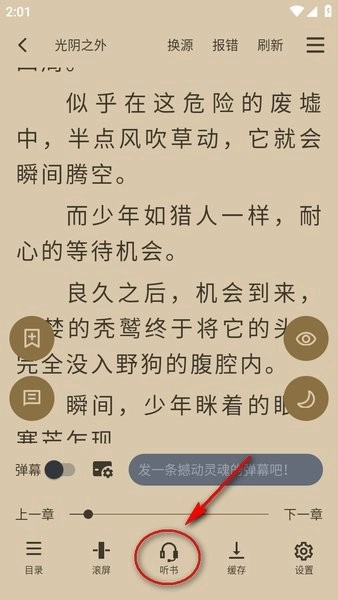 进入阅读界面后,点击一下屏幕,就会出现设置,点击底部中间的“听书”;