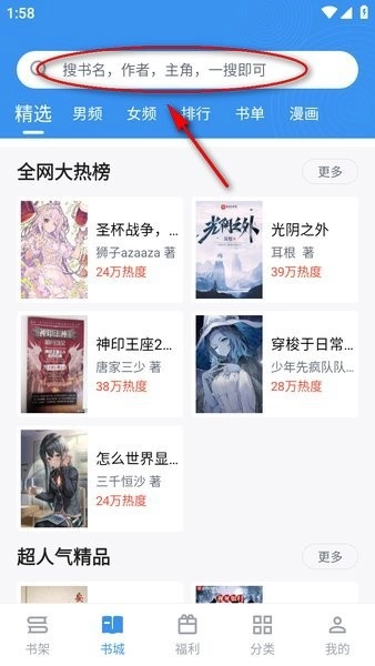 打开后,在头部搜索框输入要看的小说,可搜书名、作者、主角等;