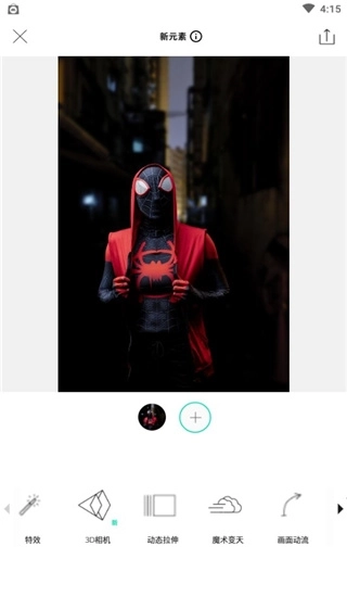 1、打开应用后点击“+”按钮,可从你的手机图库或我们提供的素材库中挑选一张图片。在为图片添加特效前,你可以先对照片进行自由编辑调整。