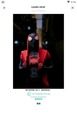 4、保存好你的vimage,就可以准备发布啦。只需点击一下按钮,就能把它分享到Instagram或其他任意社交媒体平台,让你的创意收获应得的认可。