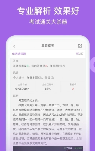2、全面收录建设部消防师执业资格考试的全部题库,消防师历年真题与模拟题均完整包含,一题不缺。