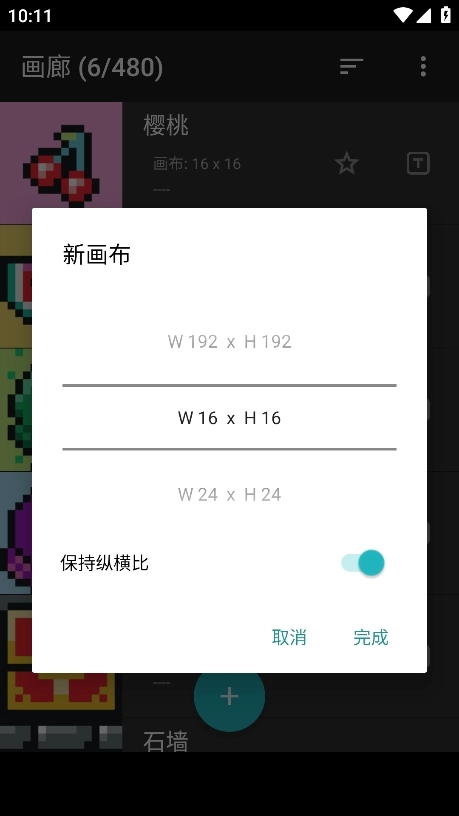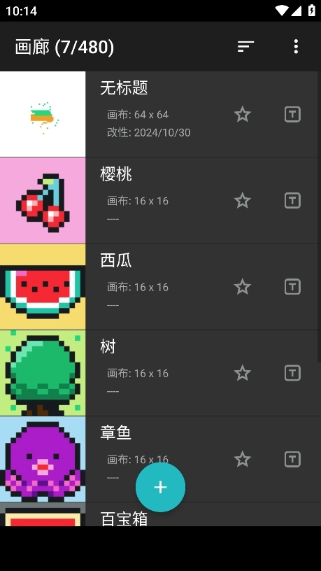 1、进入软件后,你会看到不少像素画作品,点击加号图标就能创建新的画布。