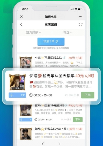 你可以直接在这里挑选陪玩人员并下单,随后就能享受到相应的陪玩服务。