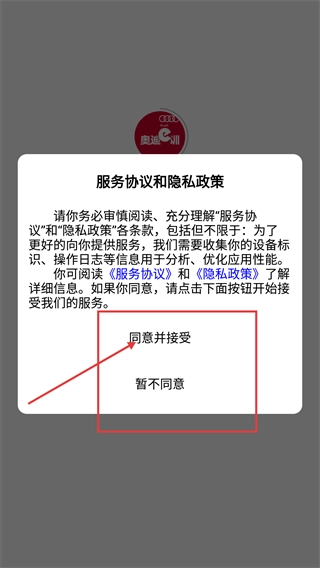 1、在使用【奥迪训】的相关服务前,您需要先阅读【服务协议】与【隐私政策】,点击【同意并接受】按钮后,就能继续使用该服务了。