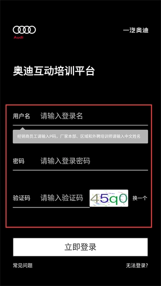 2、在【奥迪互动培训平台】的登录页面,经销商员工需将【P码】作为用户名输入,其他人员则输入中文姓名,接着填写密码与验证码,之后点击登录按钮即可。