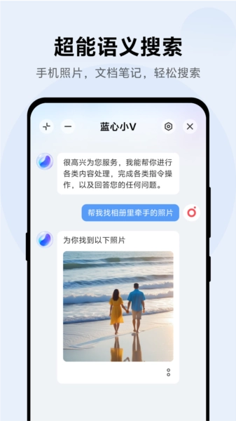 手机资料轻松找:蓝心小V能够全面搜索手机内的所有信息,不论是新拍的照片还是刚的文档,它都能在瞬间为你呈现。