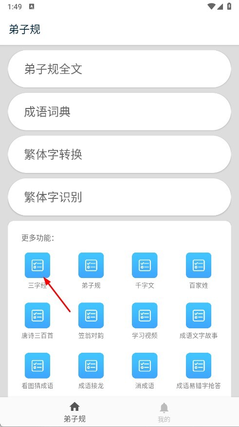 1、打开《弟子规》应用,在首页的更多功能区域找到并点击“三字经”选项,即可进入三字经的学习页面。
