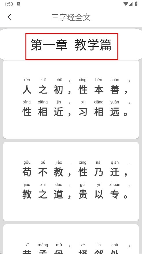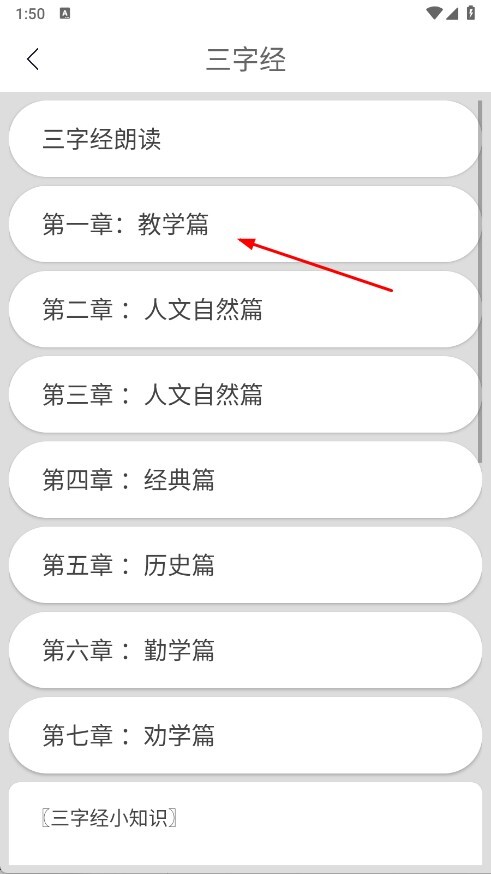 2、在三字经页,选择第一章教学篇,查看对应内容。
