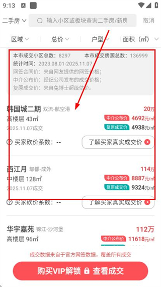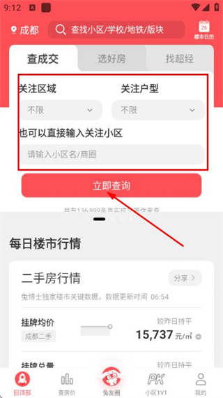 1、进入查成交页面后,可选择区域、户型,也能填写小区名称或商圈,点击“立即查询”按钮即可获取成交信息。