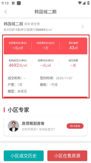 3、在详情页面,查看合同签约价、成交机构等与成交相关的信息。