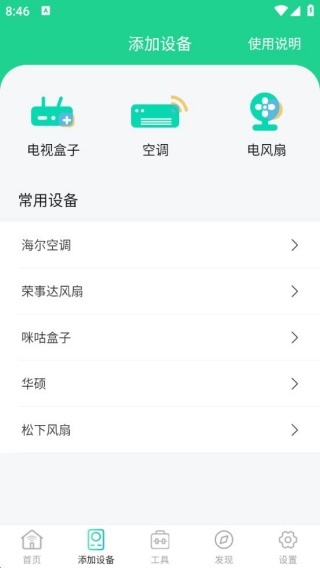 2、添加设备时,可选择电视盒子、空调、电风扇进行设置。