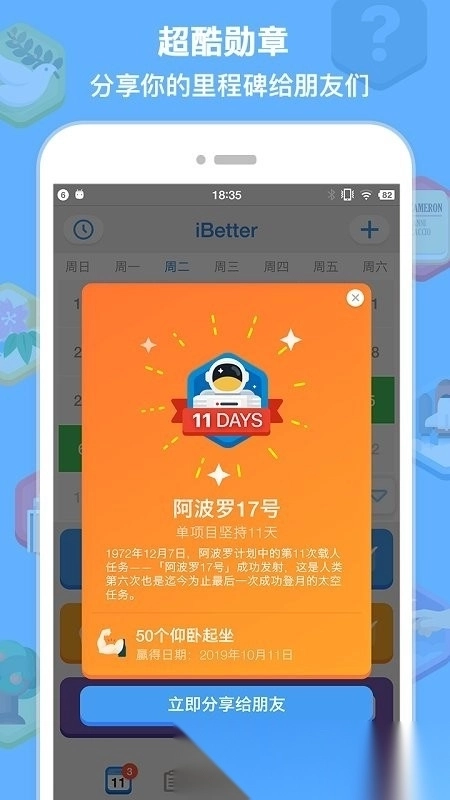 这款应用会每日推送提醒与鼓励话语,跟踪记录你的成长轨迹,并准备了大量精美勋章供你收集;它专注于协助你建立优良习惯、克服不良习性,主张用7天周期塑造一个积极行为,从而改善个人生活品质。