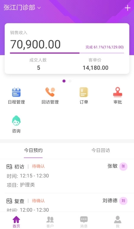 1、向用户呈现今日的预约与回访信息,便于用户提前知晓客户预约的具体内容;