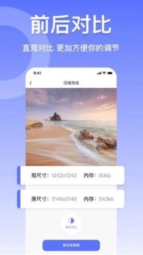 压缩图片工具手机版是一款专注于减小各类图片体积的应用。借助它高效且压缩比例适宜的功能,用户能轻松降低图片大小,优化分享与展示效果。这款应用操作简便,功能全面,用户只需一键操作,就能对图片的格式、尺寸等多个维度进行调整,以契合不同场景的需求。同时,它还支持多种导出格式,方便用户依据实际需要选择合适的格式完成转换。