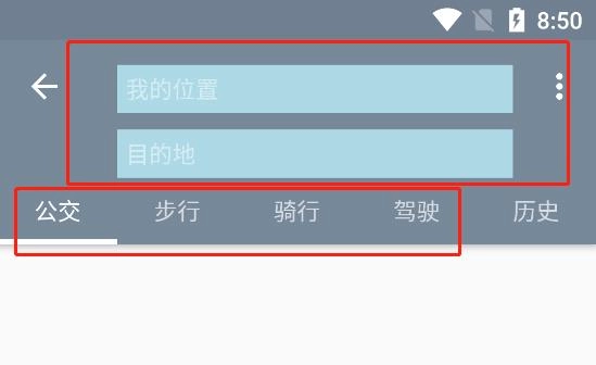 2、然后输入你的位置以及目的地,提供了公交、步行、骑行、驾驶这四种导航方法;