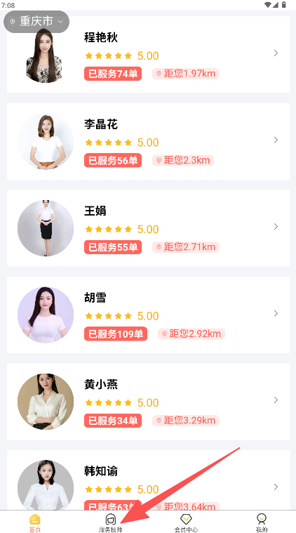 平台上展示的每位技师,都清晰呈现了服务单数、顾客好评率以及实时距离等关键信息。