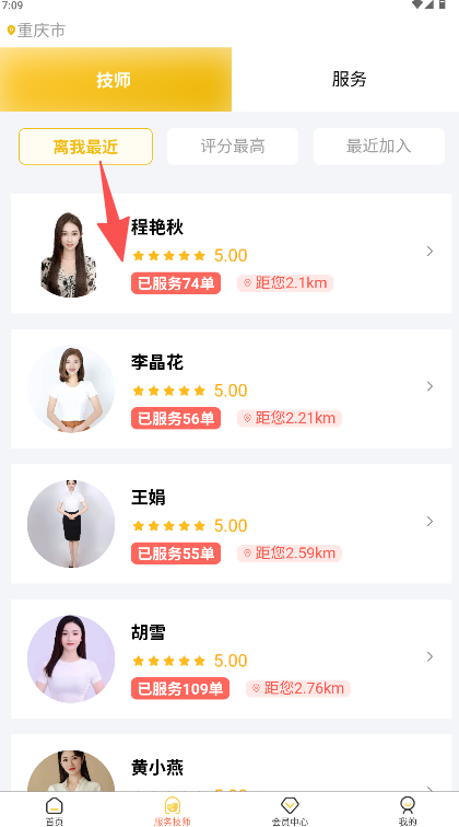 2、在页面中运用“离我最近”这类筛选条件,选定目标技师后进入其详情页面。