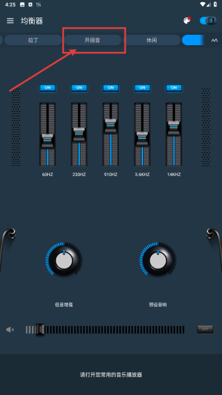 1. 开启均衡器应用程序,点击开阔音效模式选项,切换至该音频效果,从而对音乐风格进行调整。