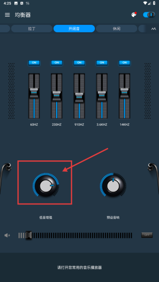 2. 处于开阔音模式时,旋转低音增强旋钮,提升低音效果,使音频听感得到优化。