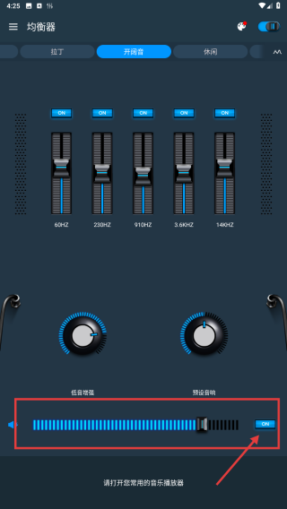 2、音效与风格调节:进入均衡器主界面后,既能够手动拖动滑块来调整不同频段的参数,也可以点击预设的音乐风格直接应用。要是想增强低音效果,还能开启“低音增强”功能,并且对强度进行调节。