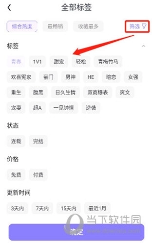3、例如选择【青春】题材的小说,点击右侧的筛选功能,还能添加【1v1】、【甜宠】或【轻松】等更多标签,从而更精准地找到目标内容。