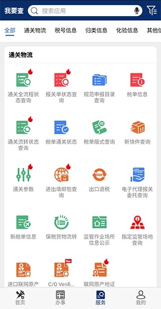 2、【办事】页面可为用户提供各类事项办理服务,涵盖运输工具类、货物通关类、物品通关类等业务类型。