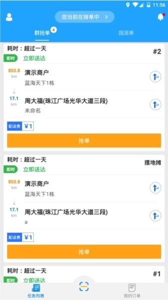 接单功能方面,快跑者配送端既支持在群组内抢单,也能接收定向指派的订单;收单时可通过扫码或输入订单码的方式快速完成;此外,还具备协助商户代为录入订单的服务。