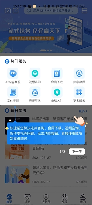 2、普通用户开通法务服务套餐后,您所遇到的各类法律问题,均需通过屏幕下方的“法务部”入口进行咨询与解决,届时将有专属团队为您提供服务;