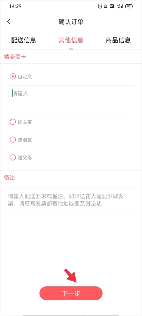 7、其他信息就是要填写一些卡片内容,勾选你送花的对象,备注配送要求或相关条件,点击下一步