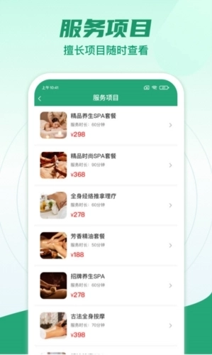 3、项目管理:可以有多种项目(刮痧、中式按摩、头颈肩按摩等),通过"点到技师端“可以管理哪些项目可以服务。
