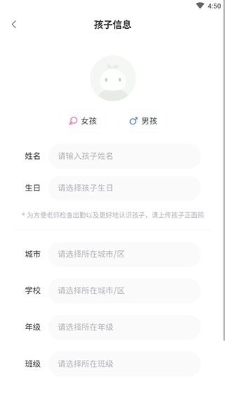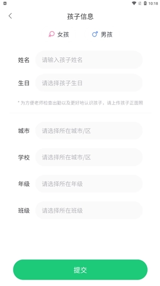 2、上传孩子信息后点击“提交”按钮。(若需绑定多个孩子,可进入底部“我的”模块,在“我的孩子”栏目左滑添加)