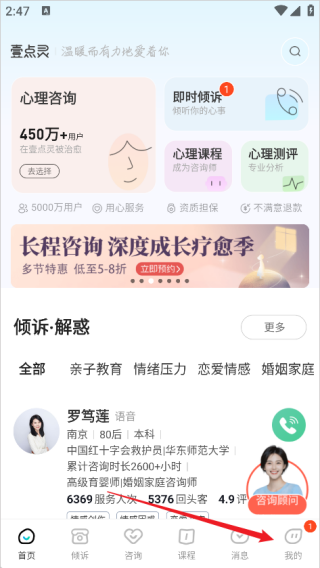 1、启动软件后进入首页,在这里既可以开展心理咨询,也能够进行即时倾诉,还能学习心理相关课程。