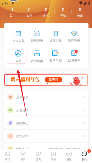 2、点击“我的”,可以查看个人相关信息,管理已有的咨询、课程等内容。