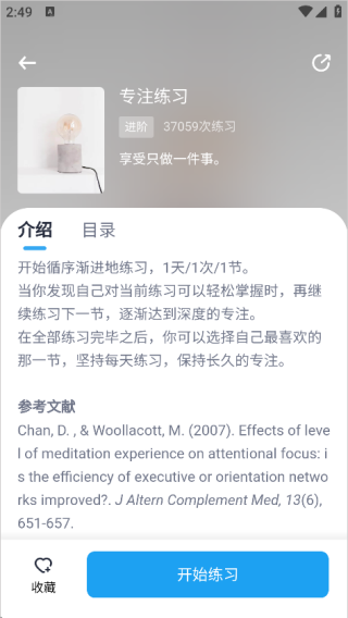 4、选择“专注练习”选项,浏览完介绍内容后,点击“开始练习”按钮,接着按照页面的引导步骤一步步完成专注练习。