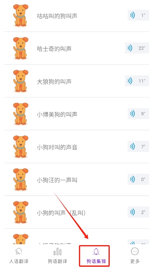3、软件中还设有“狗语集锦”板块,里面收录了狗狗在不同情境下发出的叫声,闲暇时听听这些内容,能帮助你更好地理解自家的毛孩子。