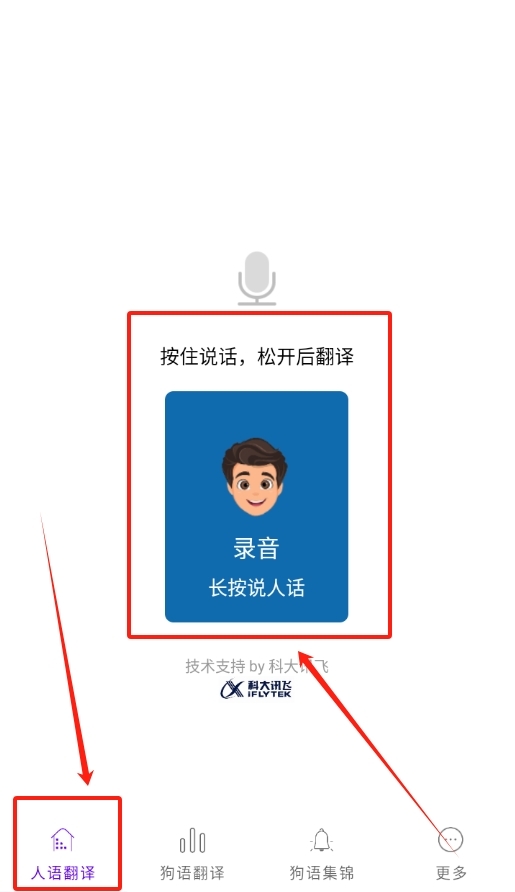 2、好奇狗狗的叫声是什么意思?点击“狗语转人声”功能,用手机录下狗狗的叫声,就能立刻将其翻译成人话啦。