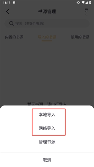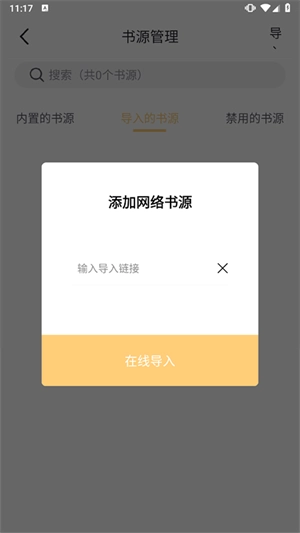 4、比如通过网络导入的方式,把书源网址复制粘贴到对应的输入框里,然后点击在线导入按钮就可以了。