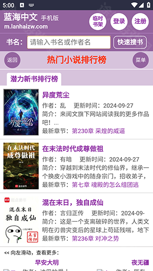 1、在蓝海搜书首页点击你喜欢的小说,点击图片和标题都能够进入