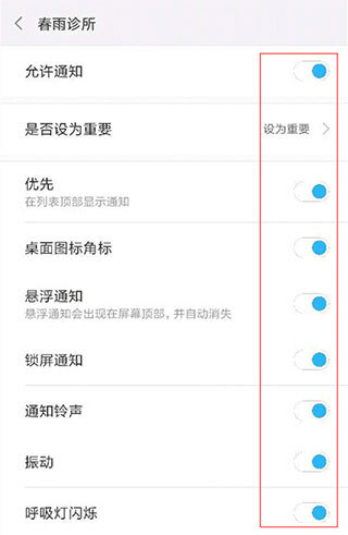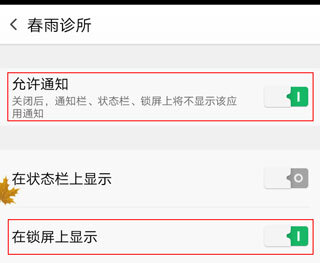 第一步:进入设置界面,找到“通知栏和状态栏”选项并点击,接着进入“通知中心”,在列表中选中【春雨诊所】,然后把该应用下的所有设置项都调整为“打开”状态。
