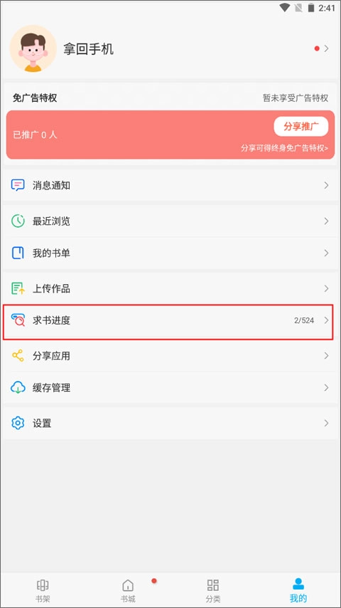 1、依旧是在【我的】页面,这次需要点击上方的“求书进度”选项。