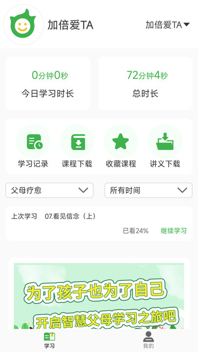 2、接下来就能看到全部功能了,比如可以记录孩子的学习时长,还有各类学习课程可供孩子观看,而且每次学习都会留下记录,方便快速回顾历史学习情况!
