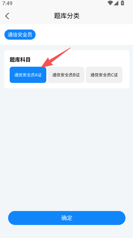 1、进入题库分类板块,选择通信安全员A证、B证或者C证对应的科目,点击确定按钮。