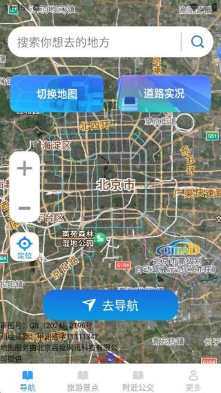 2、支持目的地搜索,拥有地图切换、道路实况查看及定位功能,可规划并引导出行路线。