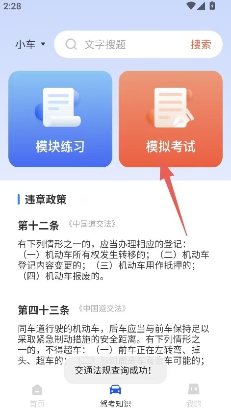 3、达成法规查询功能,支持交通法规条款的检索,助力学员熟悉理论知识,筑牢驾考根基。