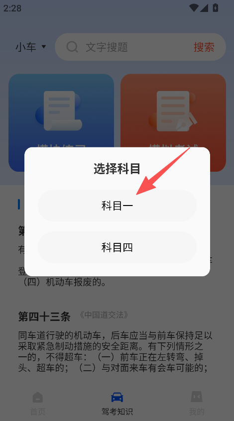 2、具备科目选择功能,学员可按需选择练习科目一或科目四,备考重点清晰,提升学习效率。