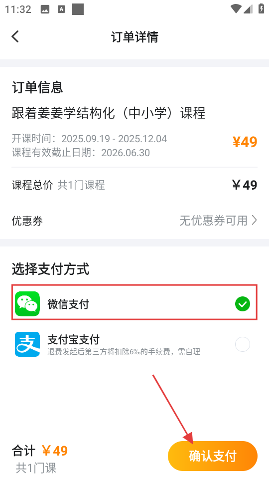4、进入订单详情页面后,先挑选好支付方式,接着点击确认支付按钮,即可完成课程的购买流程。