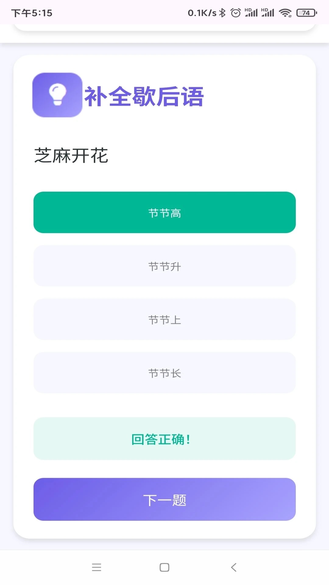 2、补全歇后语时,只需依据给出的上半句接续下半句,选择正确的选项就能进入下一题。