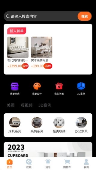 2、把家具商品进一步细化为床具系列、桌椅系列、柜类收纳、办公家具等不同类别,能够满足日常家居和办公的各类需求。