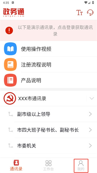 1、第一步是打开政务通应用,进入首页界面后,点击页面右下角的【我的】选项。