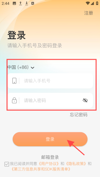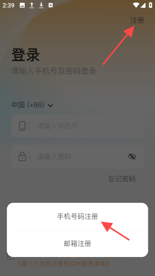 2、点击右上角的【注册】按钮,可选择通过手机号码或邮箱进行注册。